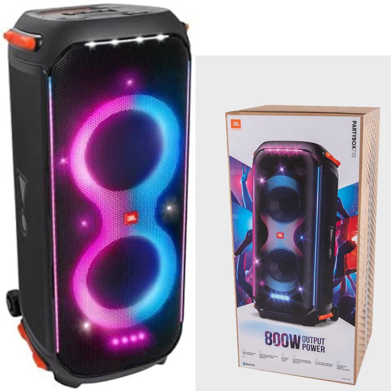 A PartyBox 710 à prova de respingos transforma seu próximo evento em uma verdadeira festa, show ou balada. Show de luzes único e colorido sincronizado com o JBL Original Pro Sound. Botões minimalistas e intuitivos no painel superior e o aplicativo PartyBox permitem criar experiências musicais e visuais de alto nível. Com luzes estroboscópicas piscantes personalizáveis e o som incrível do conjunto duplo de tweeters e woofers ricos em graves. O True Wireless Sound emparelha instantaneamente duas PartyBox 710 para uma multidão ainda maior. Com uma alça fácil de segurar e rodas robustas, os bons momentos continuam aonde quer que a festa vá.- Especificações GeraisTransdutores: 2 woofers de 216 mm, 2 tweeters de 70 mmPotência de saída: 800 W RMS (IEC60268)Entrada de energia: 100 a 240 Vac ~50/60 HzResposta de frequência: 35 Hz a 20 kHz (-6dB)Relação sinal/ruído: > 80 dBTipo de cabo: cabo de alimentação CA (o tipo varia de acordo com as regiões)Comprimento do cabo: 2,0 m/6,6 pés- DimensõesDimensões (L x A x P): 399,0 mm x 905,0 mm x 436,0 mmPeso líquido: 27,80 kgDimensões (L x A x P): 1048,0 mm x 505,0 mm x 467,0 mmPeso bruto: 31,00 kg- Especificações de Controle e ConexãoSaída do carregador USB: 5 V/2,1 A (Máx.)Formato do USB: FAT16, FAT32Versão Bluetooth®: 5,1Perfil de Bluetooth®: A2DP V1.3, AVRCP V1.6Intervalo de frequência do transmissor Bluetooth®: 2400 MHz a 2483,5 MHzPotência do transmissor Bluetooth®: = 11dBmModulação do transmissor Bluetooth®: GFSK, p/4 DQPSK, 8 DPSKFormatos compatíveis: .mp3, .wma, .wavEntrada Auxiliar: 250 mVrms (conector de 3,5 mm)Entrada de microfone: 20 mVrmsEntrada de violão/guitarra: 100 mVrmsEntrada USB/Bluetooth: -12 dBFS- Qual o conteúdo da caixa?1 Caixa de som JBL Party Box 7101 Guia de início rápido1 Cartão de garantia1 Ficha de segurança1 Conector de energia AC em ângulo reto (o plugue AC varia conforme a região)