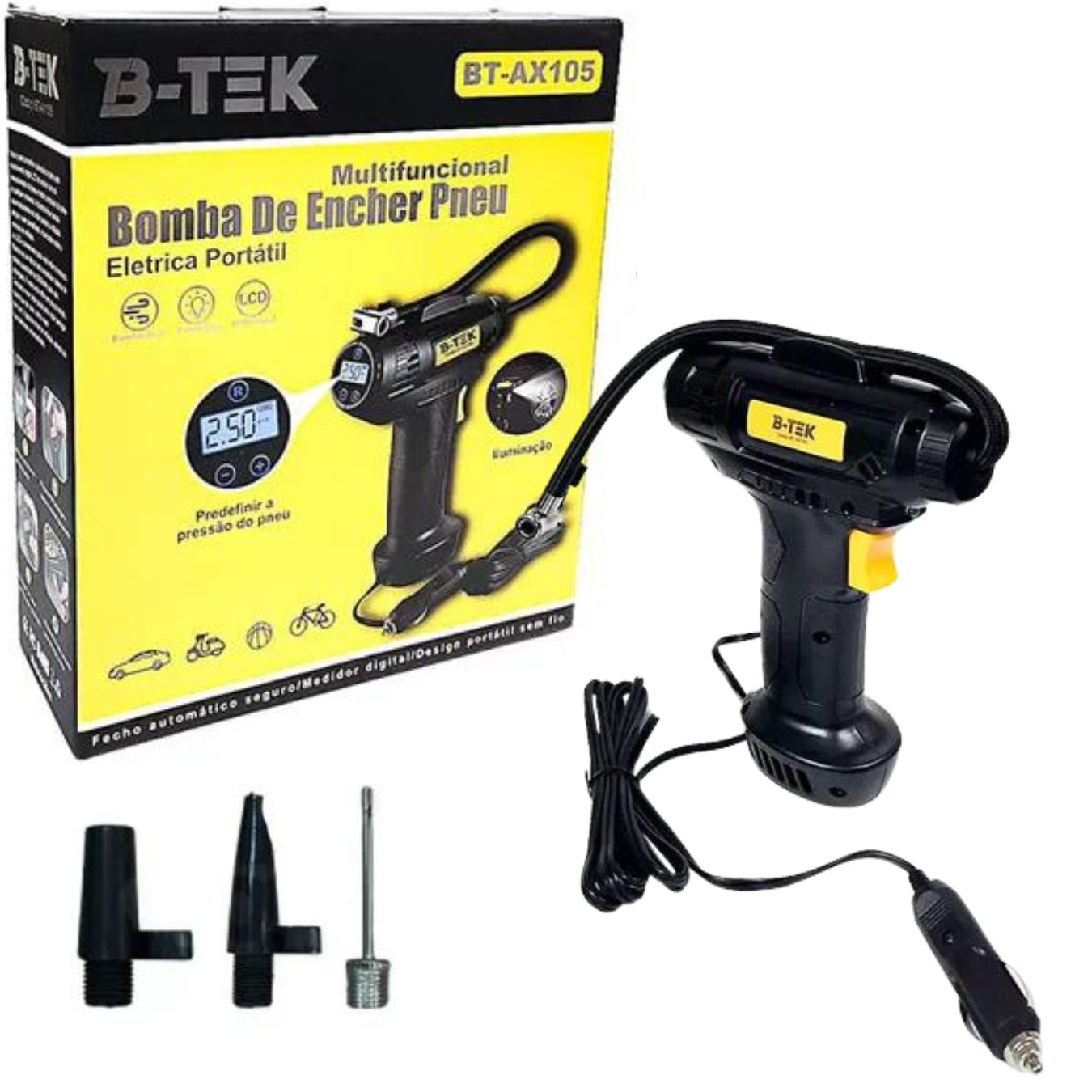Bomba de Ar Elétrica Multifuncional Painel LCD B-Tek BT-AX105Bomba elétrica para encher pneus, bolas, colchões infláveis, entre outros...Com painel digital LCD para predefinir a pressão.Acompanha 3 bicos para diferentes aplicações.Compacta e leve, ideal para deixar no carro.Tamanho da mangueira: +-45 cmMaterial: ABSPotência: 120WAlimentação: Tomada do carro (Acendedor de cigarros)Tamanho: 21,5 x 17 cm