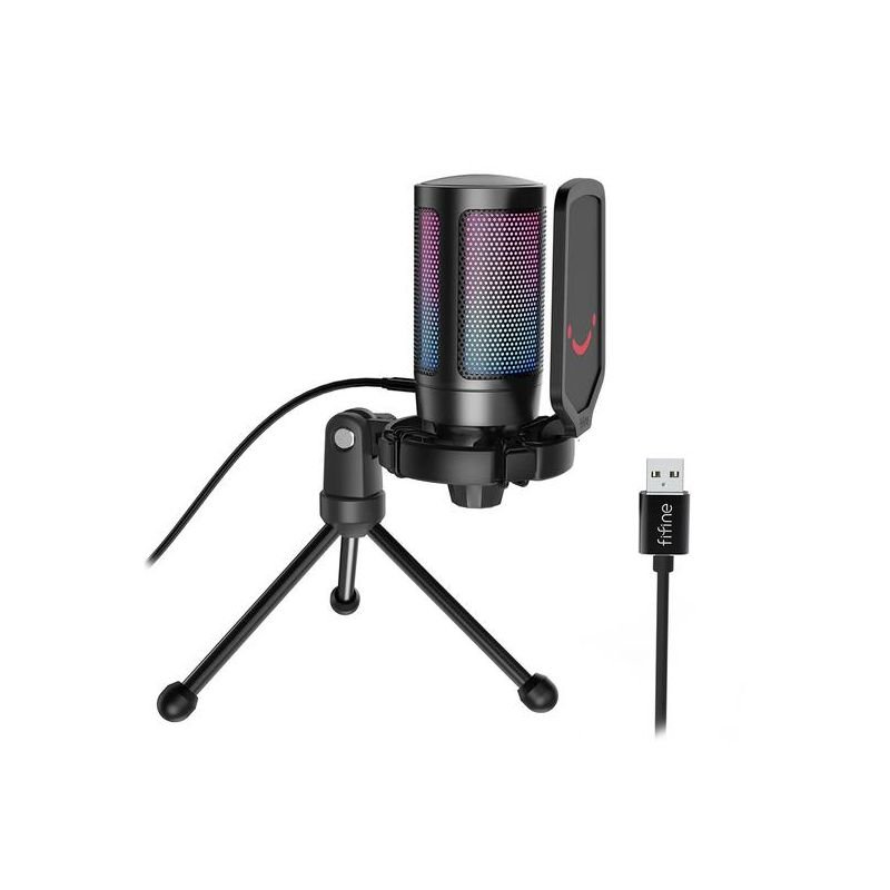 O Microfone Gamer USB Fifine A6V com Iluminação RGB em Preto é uma escolha ideal para gamers e criadores de conteúdo que buscam alta performance e qualidade de som excepcional. Equipado com tecnologia de captação avançada, este microfone proporciona gravações claras e precisas, garantindo que sua voz seja ouvida com clareza durante transmissões ao vivo, gravações de podcasts ou vídeos. O design moderno e elegante, juntamente com a iluminação RGB personalizável, agrega estilo ao seu setup, criando uma atmosfera envolvente enquanto você joga ou produz conteúdo.\n\nAlém de sua estética impressionante, o Fifine A6V é fácil de usar, sendo plug-and-play, o que significa que não há necessidade de instalar drivers complicados. A sua compatibilidade com diversas plataformas garante que você poderá utilizá-lo em não apenas em jogos, mas também em reuniões virtuais, chamadas de vídeo e gravações. Com um padrão polar cardioide, ele minimiza o ruído de fundo, permitindo que você se concentre no que realmente importa: seu desempenho e interação com o público. Aposte na qualidade e inovação do Microfone Gamer USB Fifine A6V para elevar sua experiência sonora a um novo patamar.