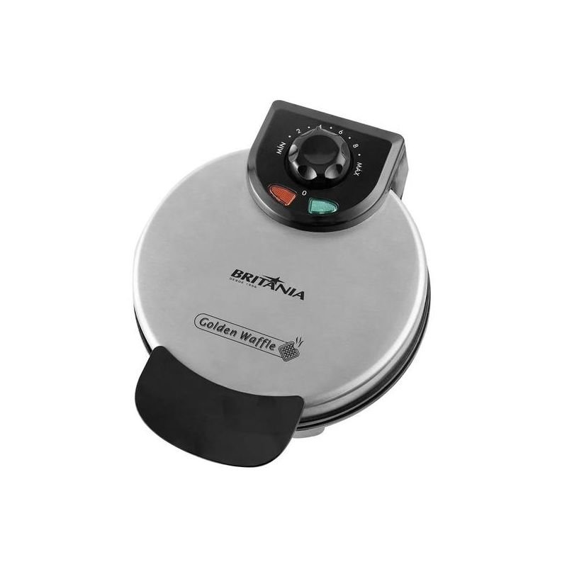 A Waffleira Elétrica Britânia Golden 850W é a escolha perfeita para quem deseja preparar waffles crocantes e saborosos no conforto de sua casa. Com sua potência de 850W, este equipamento proporciona um aquecimento rápido e uniforme, garantindo que os waffles fiquem no ponto ideal. Seu design moderno nas cores prata e preto não apenas complementa a sua cozinha, mas também facilita a sua limpeza, graças ao revestimento antiaderente das placas.\n\nAlém de ser prática, a Waffleira Britânia conta com luz indicadora que sinaliza quando o aparelho está pronto para uso e um sistema de fechamento que mantém a massa no lugar durante o cozimento. Compatível com a rede elétrica de 110V/60Hz, este produto combina eficiência e estilo, tornando-se indispensável para quem aprecia a gastronomia. Prepare deliciosas receitas e surpreenda sua família e amigos com waffles irresistíveis, prontos em poucos minutos.